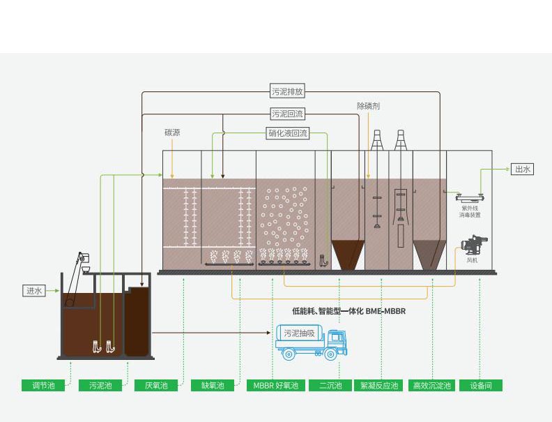 MBBR系統(tǒng)運行中產(chǎn)生的少量剩余污泥先排入污泥濃縮池濃縮,濃縮后上清液回流至調(diào)節(jié)池,濃縮污泥定期處置外運(如配套污泥脫水系統(tǒng)則脫水后泥餅外運)。